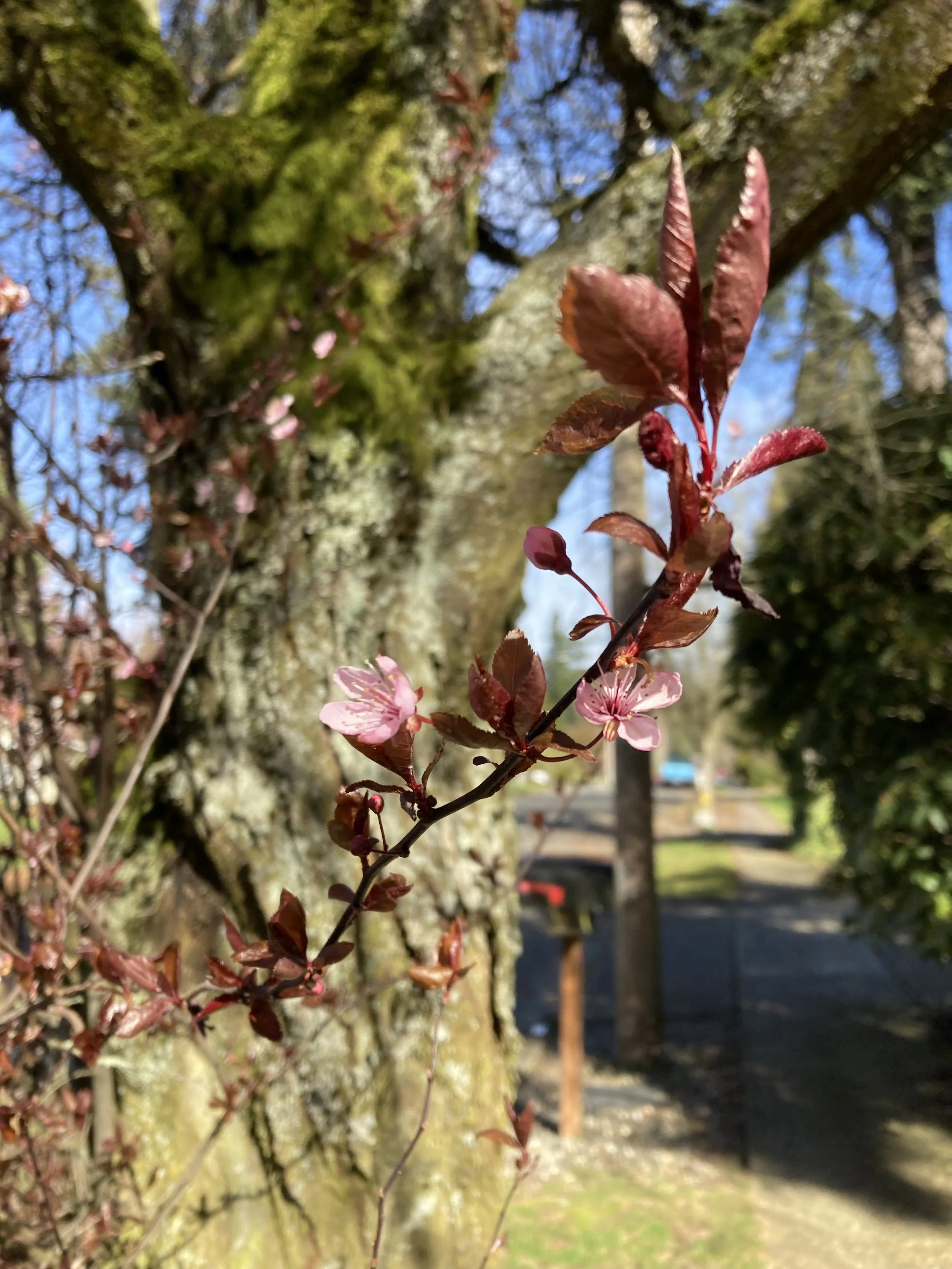 Instead, I watched the cherry trees on my street closely as they continued blooming, shed seas of petals, and were replaced by deep purple leaves. Then the next tree bloomed bright white, and faded; then the tree next to that bloomed in perfect pink blossoms. The Japanese olive tree with its small, spiky leaves blossomed slowly into tufts of tiny, white, trumpet shaped blossoms. The moss on the walkway outside is turning greenish-brown, from the bright mossy green of a wet winter. The grass out back is growing in again, long and kelly green, over the dried stalks of the last yield. It is time to mow, and start fresh.